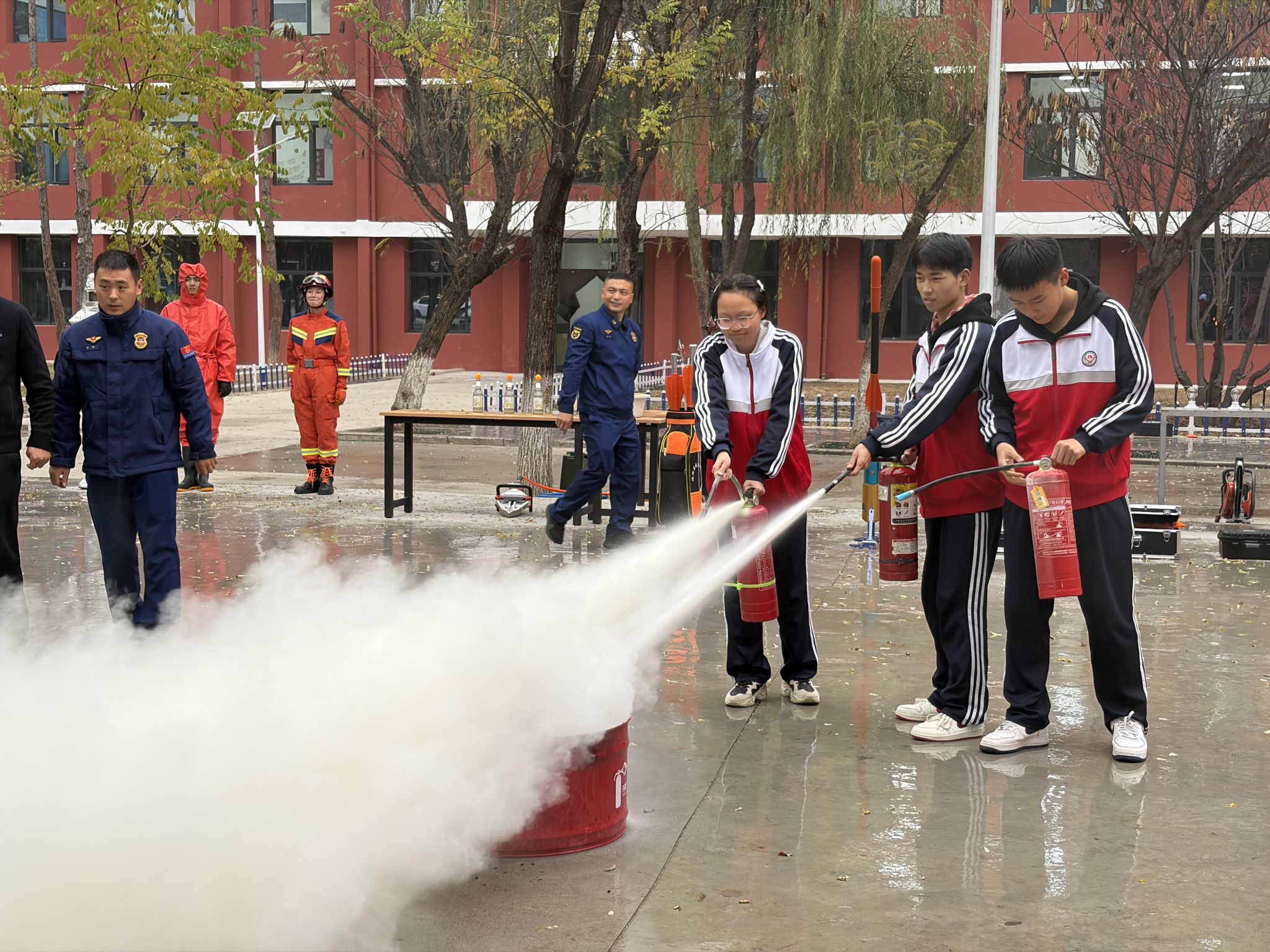 演练现场的消防知识普及区更是热闹非凡,消防救援学院的师生们带来了一场 “沉浸式” 安全课堂。干粉灭火器、二氧化碳灭火器、消防水带、空气呼吸器等 20 余种专业装备整齐陈列,实训队员化身“讲解员”为中职师生讲解操作要点。“大家记好‘提、拔、握、压’四步法,提住瓶身时要稳,拔掉保险销别慌,握喷管要对准火焰根部……” 实训队员一边演示,一边邀请中职师生上台实操。此外,消防救援学院的实训队员还展示了“班队列”风采,整齐划一的步伐踏在田径场上,发出“唰唰”的声响;消防救援车现场演示水带快速连接,高压水柱直冲10余米高空,在蓝天映衬下格外震撼,让师生们直观感受到专业消防装备的强大威力。