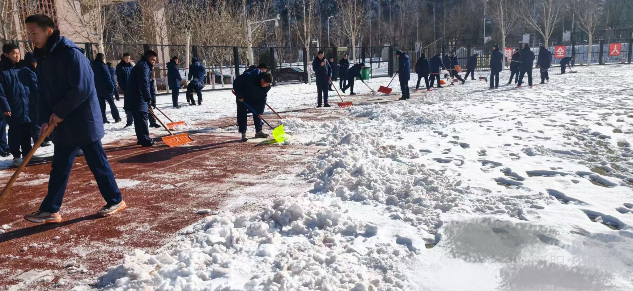 寒风中,同学们的脸颊冻得通红,发梢凝结起细碎的冰花,但手中的动作丝毫没有放缓。大家不畏严寒、干劲十足,铁锹与地面的摩擦声、同学们的吆喝声交织在一起,成为冬日校园里最动人的旋律。