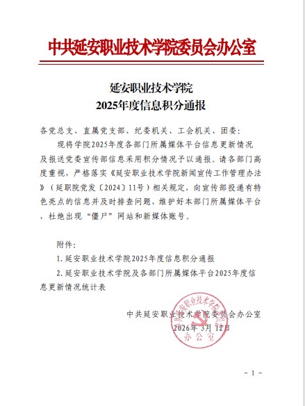 3月12日,延安职业技术学院发布2025年度信息积分通报,消防救援学院凭借扎实的信息宣传工作,以89分的全年累计积分荣获全院第三名和教学系部第一名的好成绩。